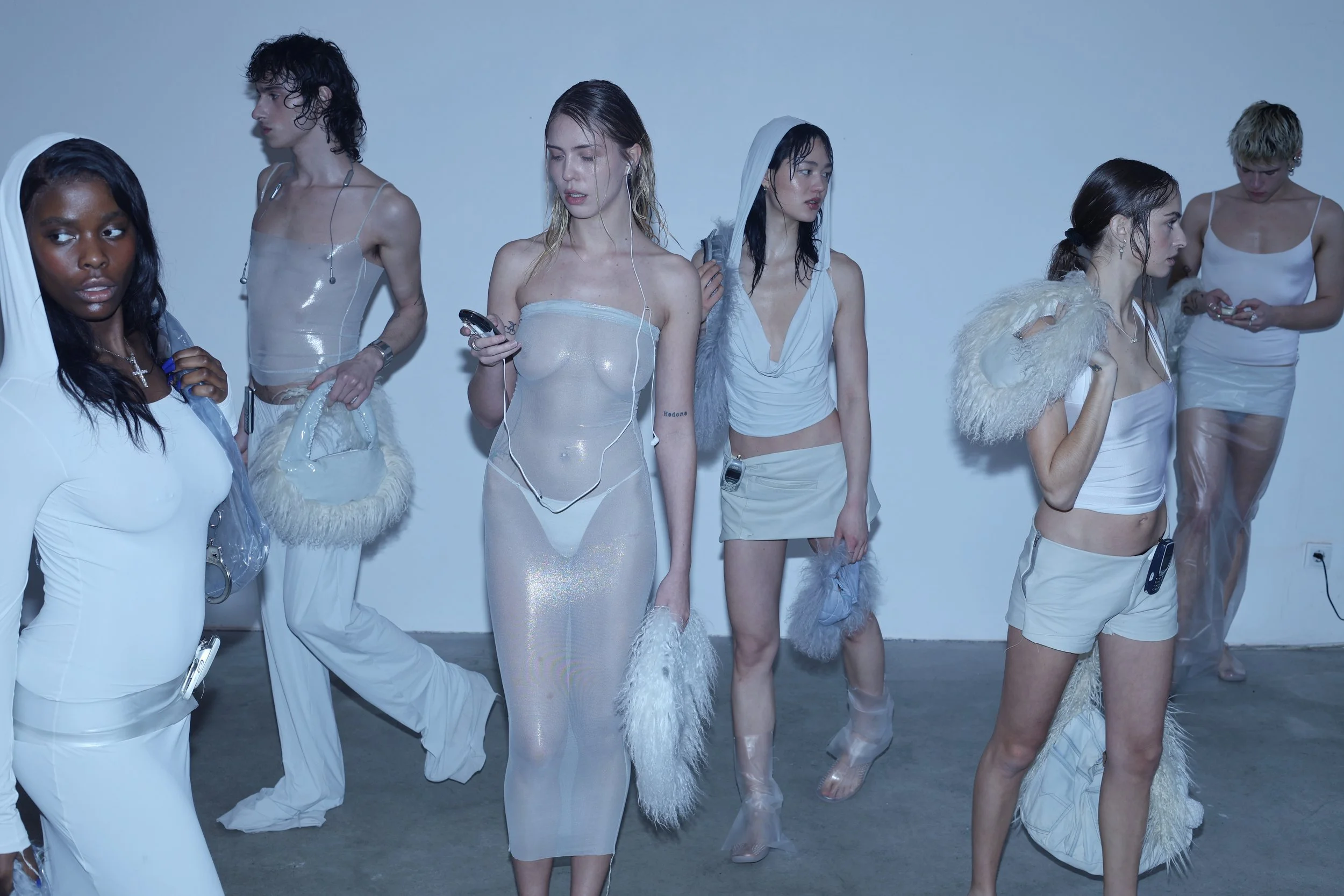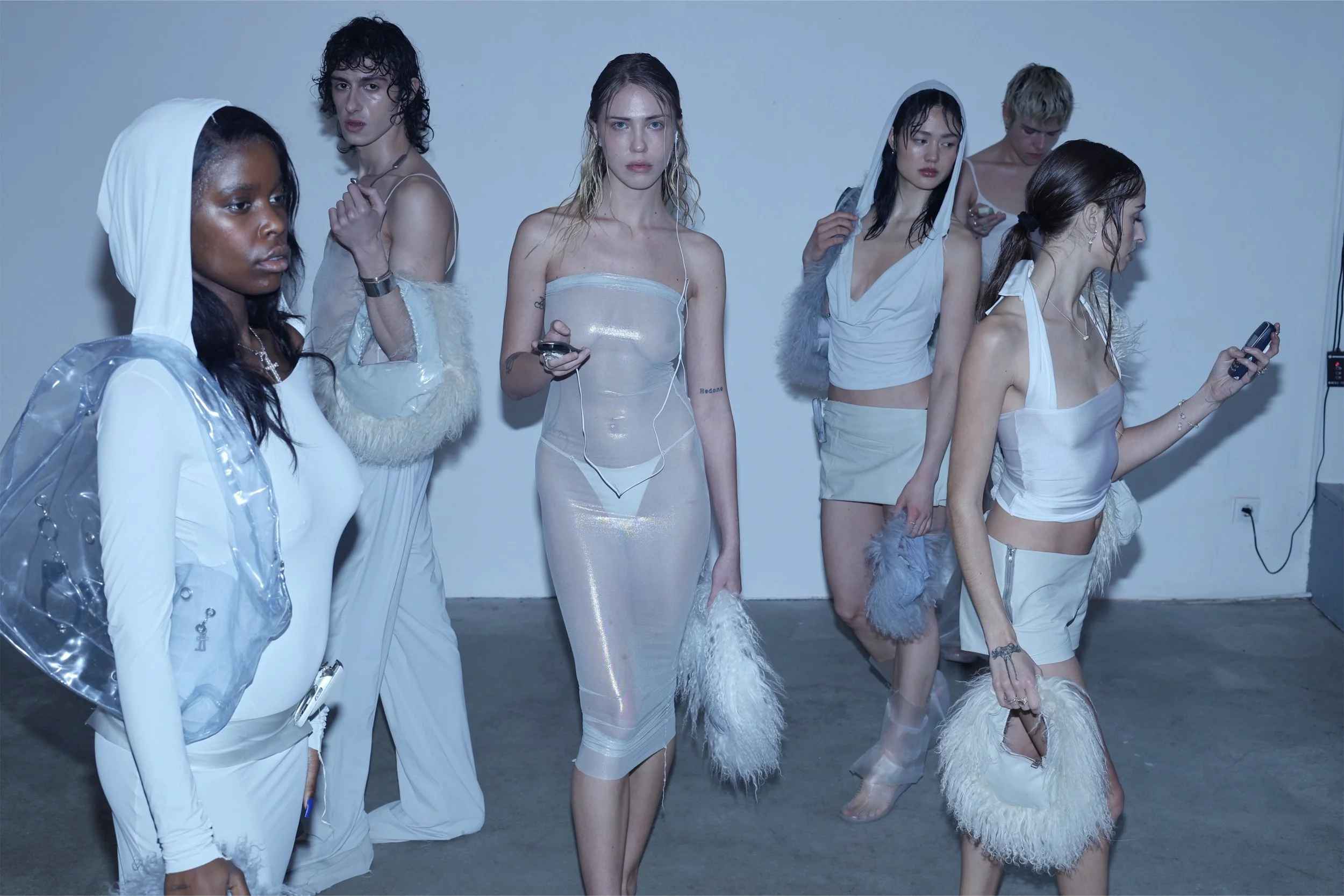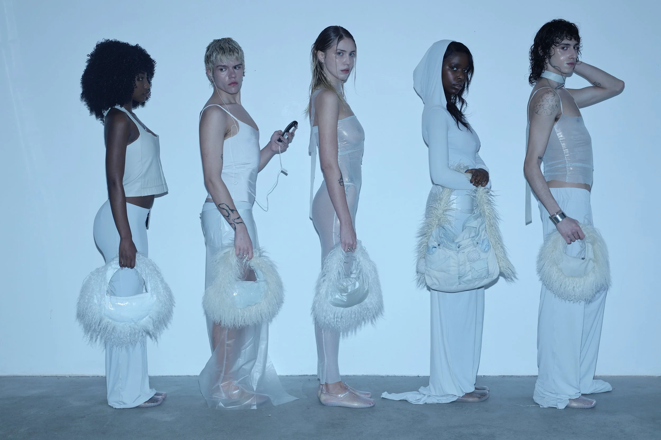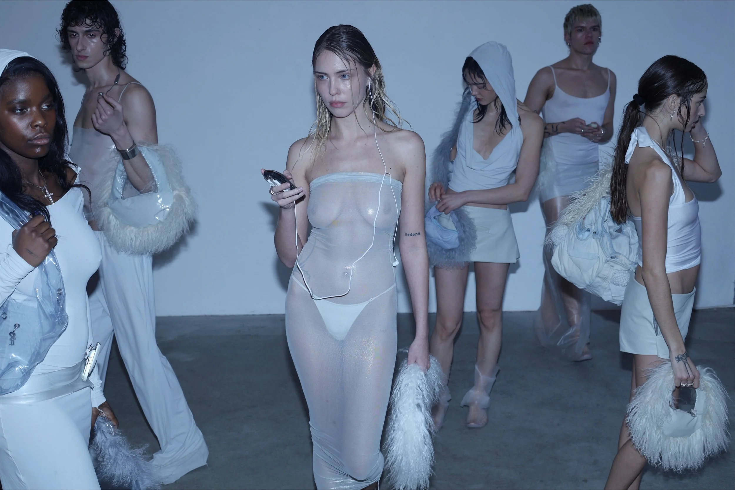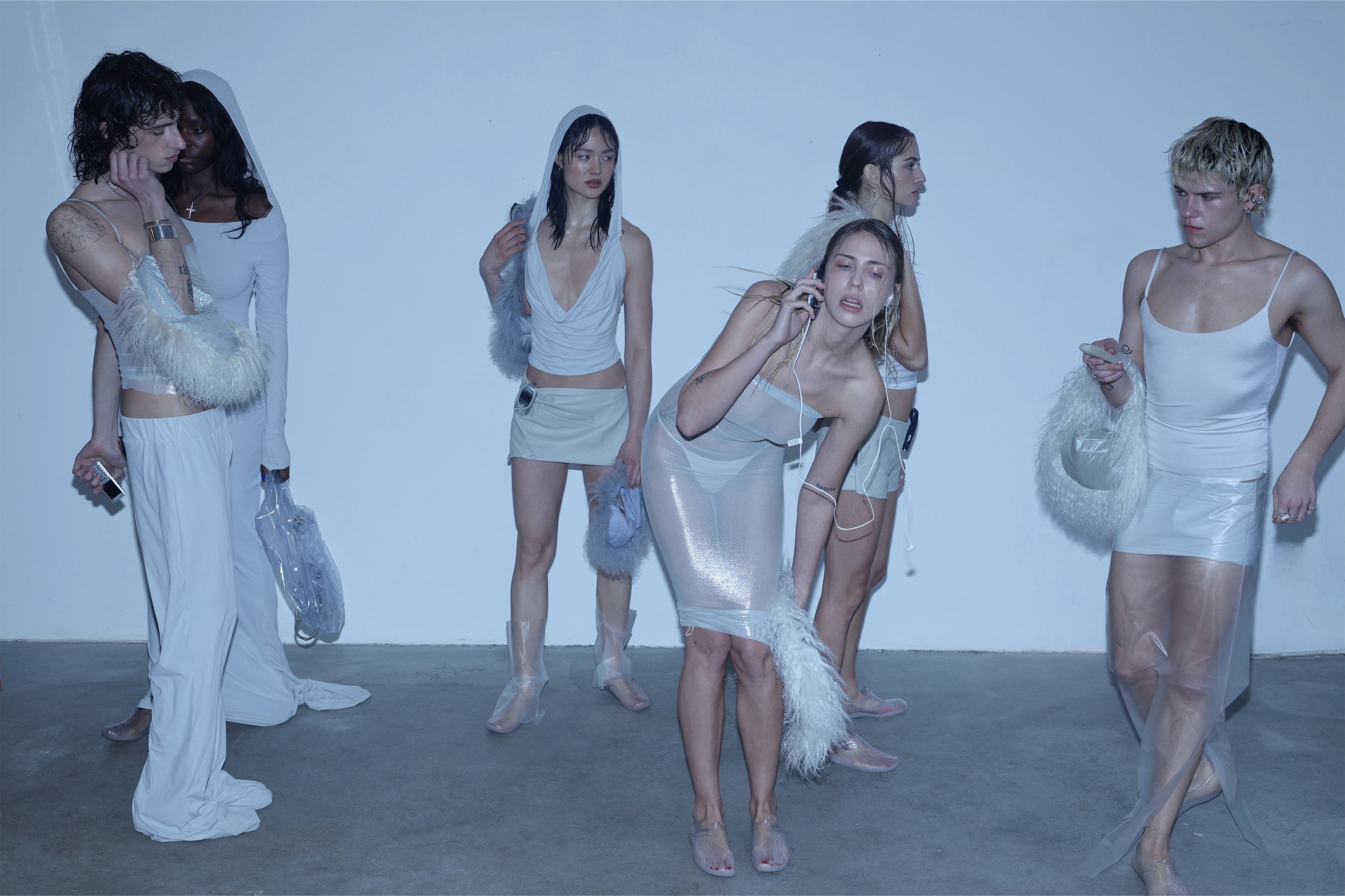 Group of models in minimalist sheer and white outfits, feather accessories, holding electronic devices, in an indoor setting with a plain background.