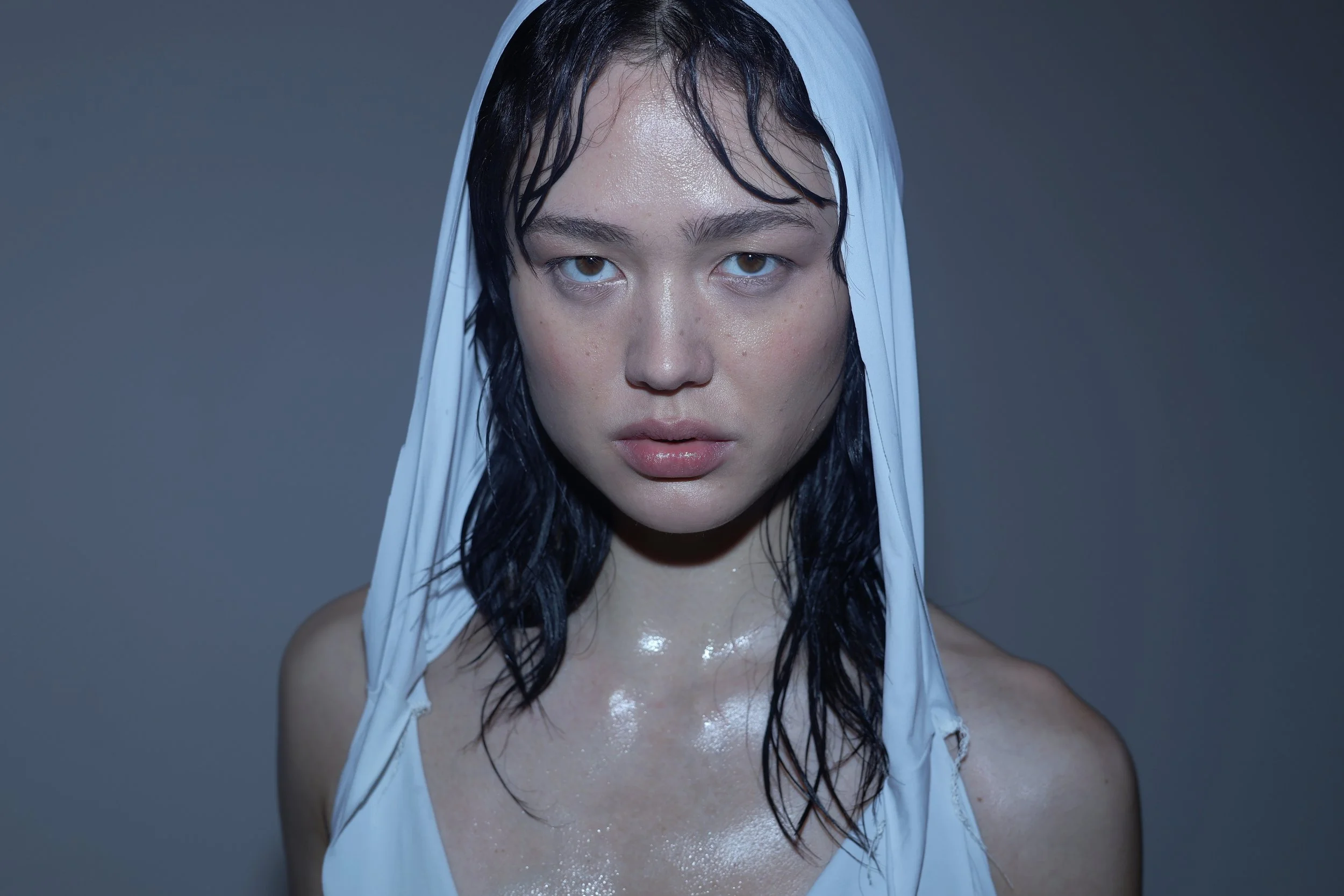Person with wet hair, wearing a white hood, and looking directly at the camera.