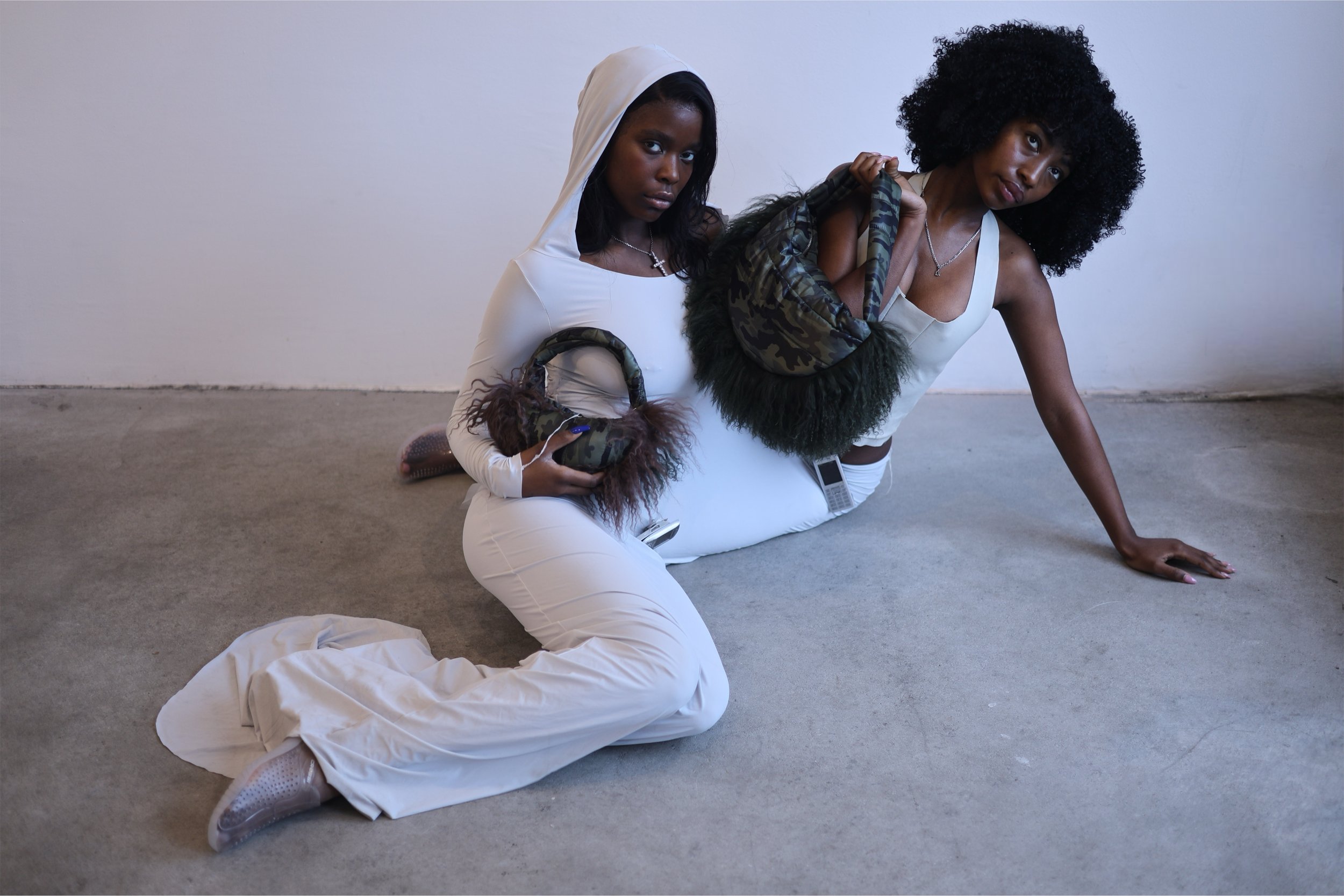 Two people in white outfits, one sitting holding a fluffy white bag, another standing with a camo bag. Clear chairs and a shaggy white chair in the background.