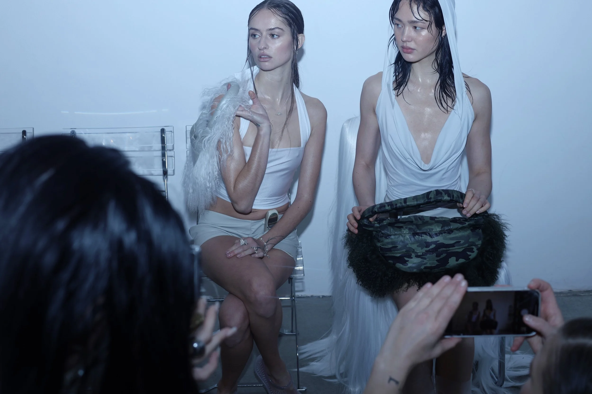 Two models sitting on clear chairs, one holding a fluffy white shawl, the other a camo-patterned bag. They have wet hair and are dressed in light clothing. A person is taking a photo with a smartphone in the foreground.