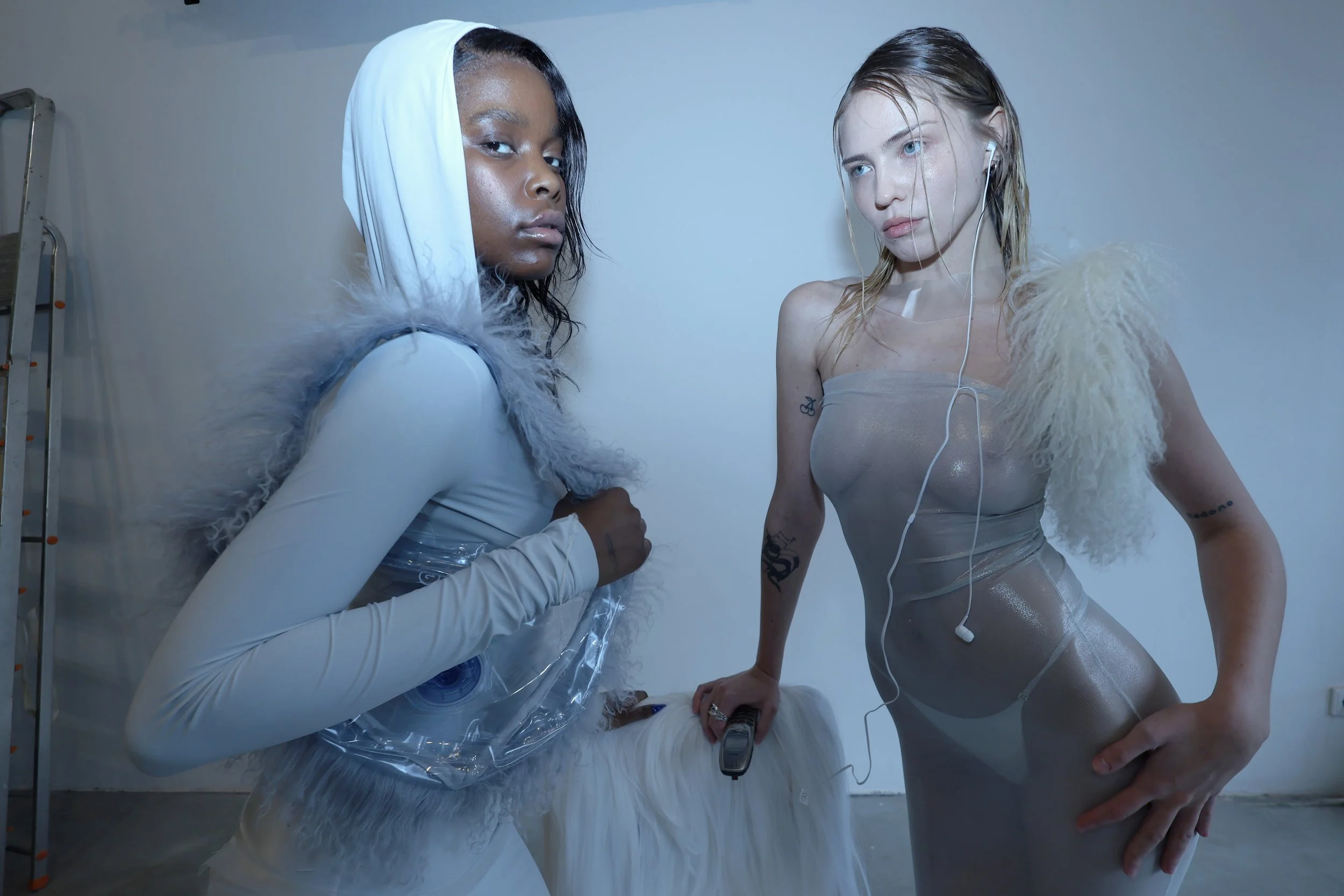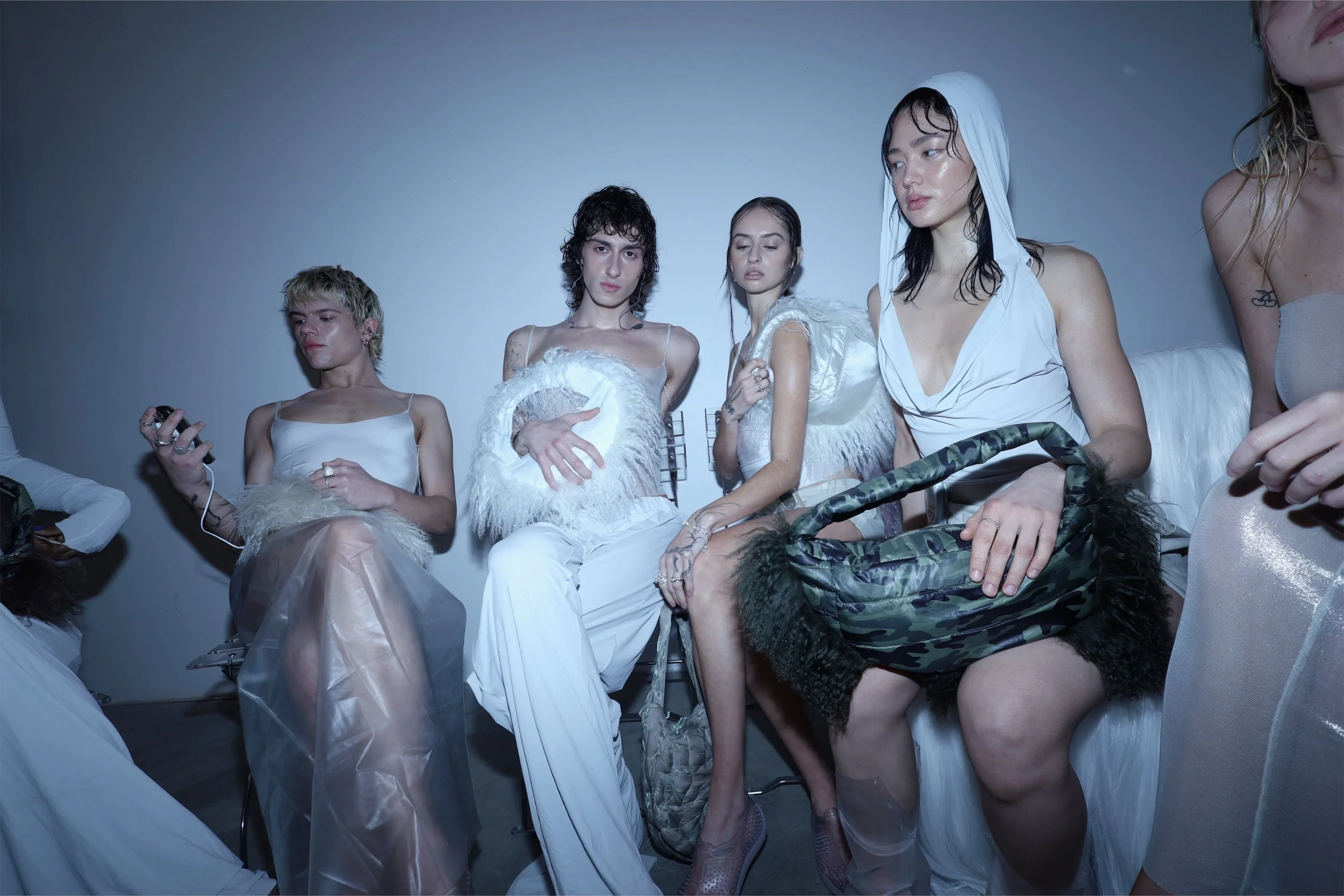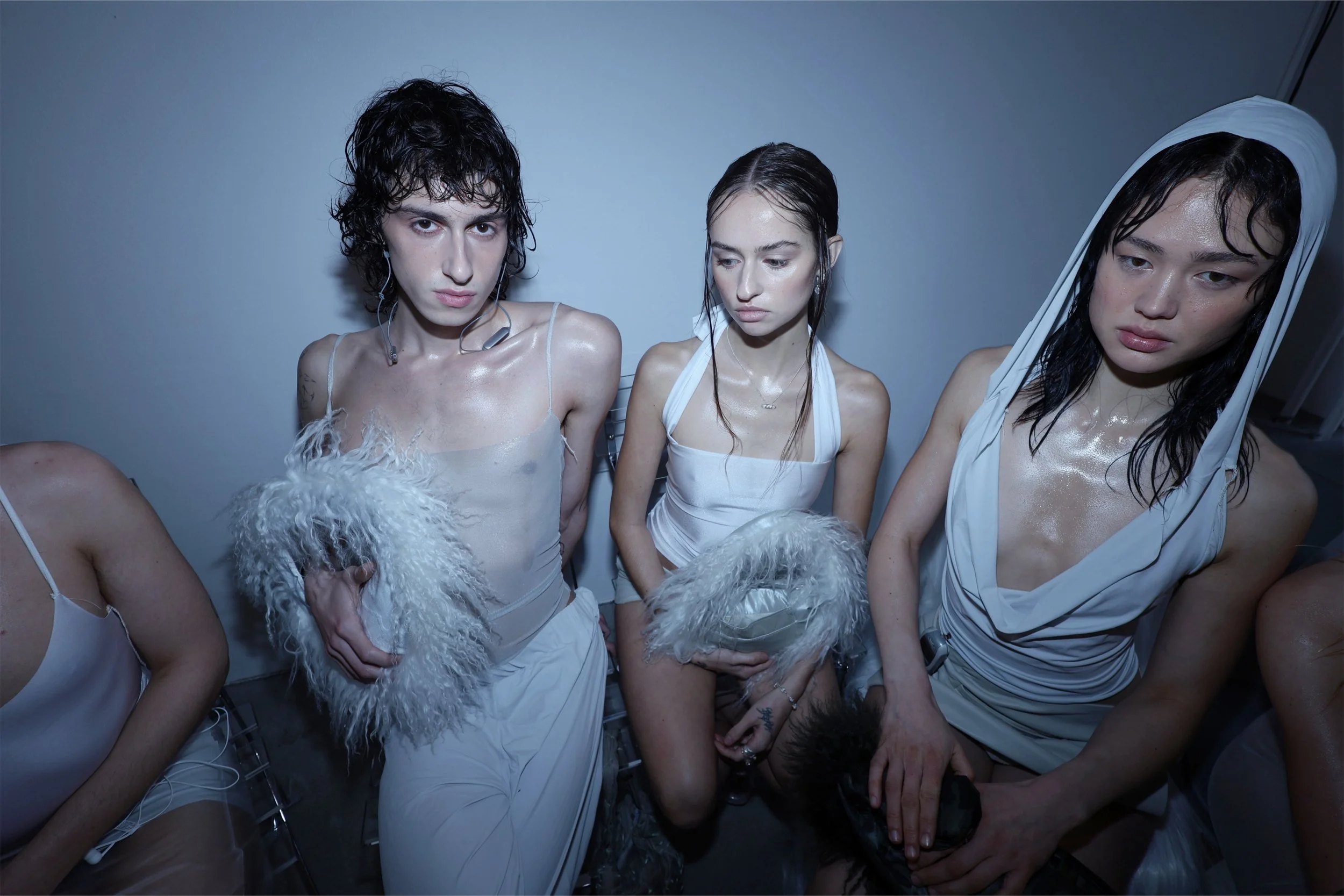 Models in minimal white outfits sitting against a white backdrop, holding white feather accessories. Fashion show atmosphere, dimly lit, with shiny skin and wet hair.