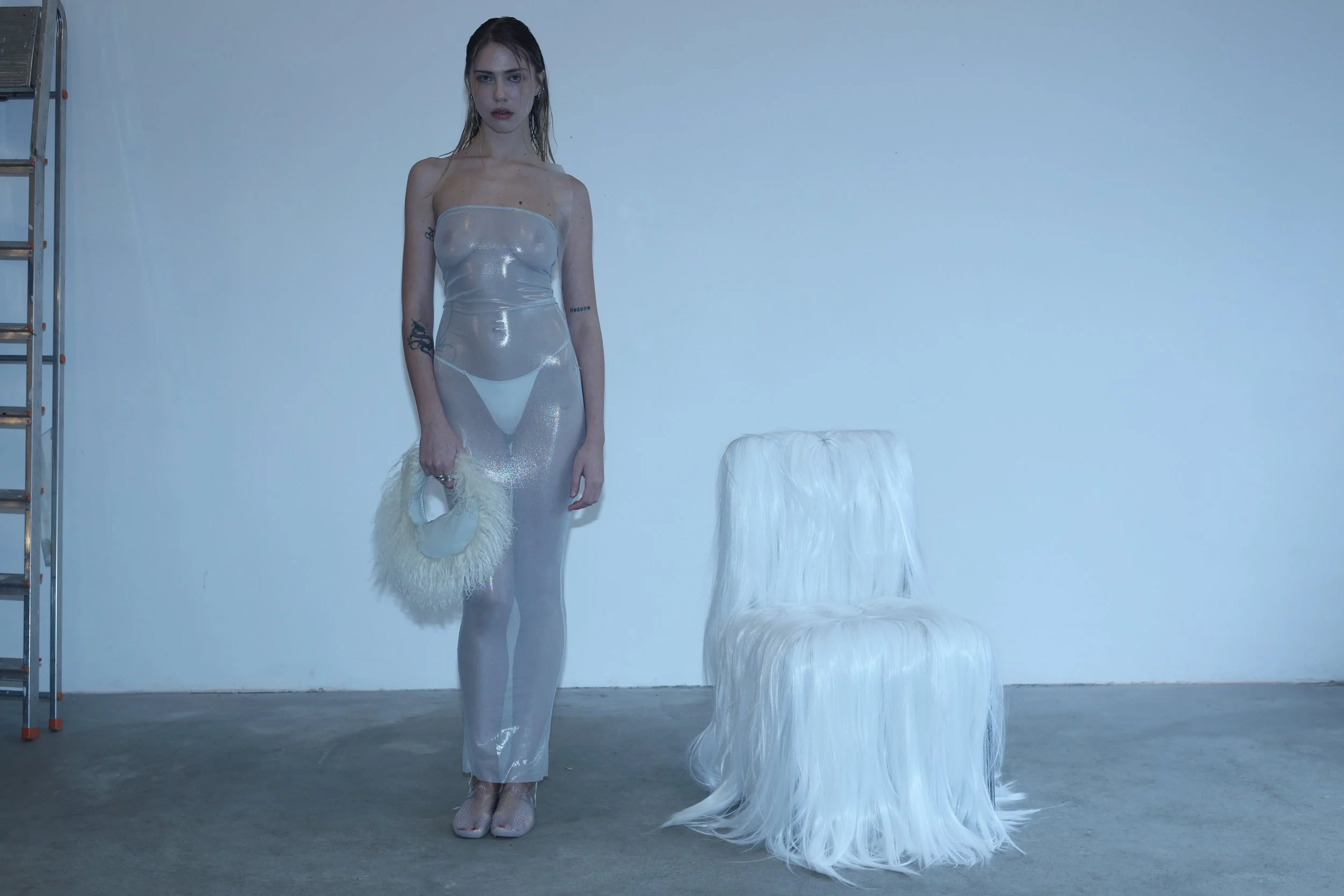 Person in a semi-transparent dress holding a furry bag next to a white faux fur-covered chair.
