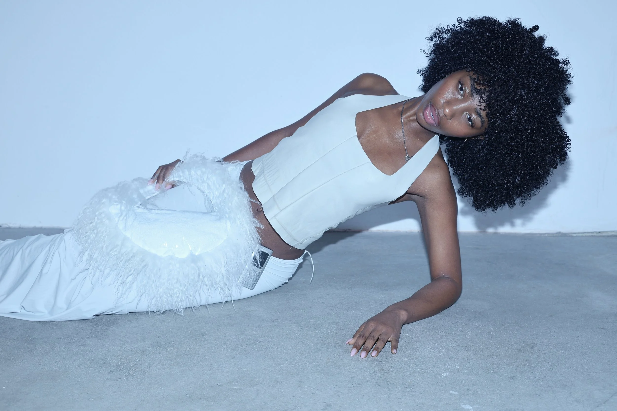 Fashion model reclining on concrete floor, wearing a white halter top and pants, with curly hair.